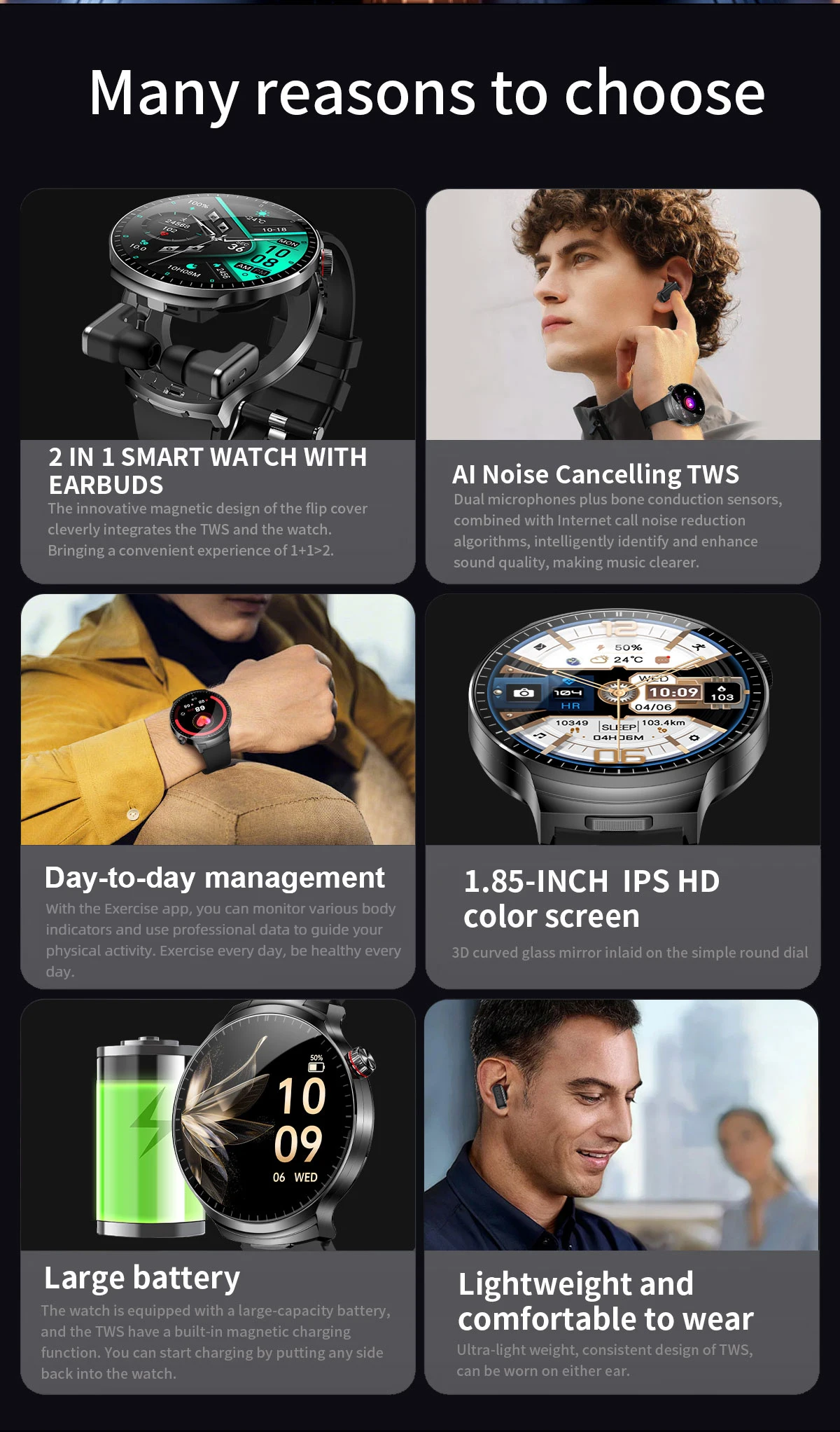 Full in-ear wearing, painless and comfortable. Metal craftsmanship, perfect sound quality, with handle design, two-way noise reduction, call more clear, using stable Zhongke Bluetooth (AB5656A2) high quality and stable dual-issue does not distinguish between master and slave, super strong signal Bluetooth signals in open areas up to 25 meters, through the wall up to 15 meters, built-in 5.0 dual Bluetooth, HIFI 9D sound quality, touch sensors, AI voice SIRI wake up. The headset is put into the watch compartment storage that is charging, take it with you, put it in the watch compartment for easy storage, the headset is stored in the watch that is charging.